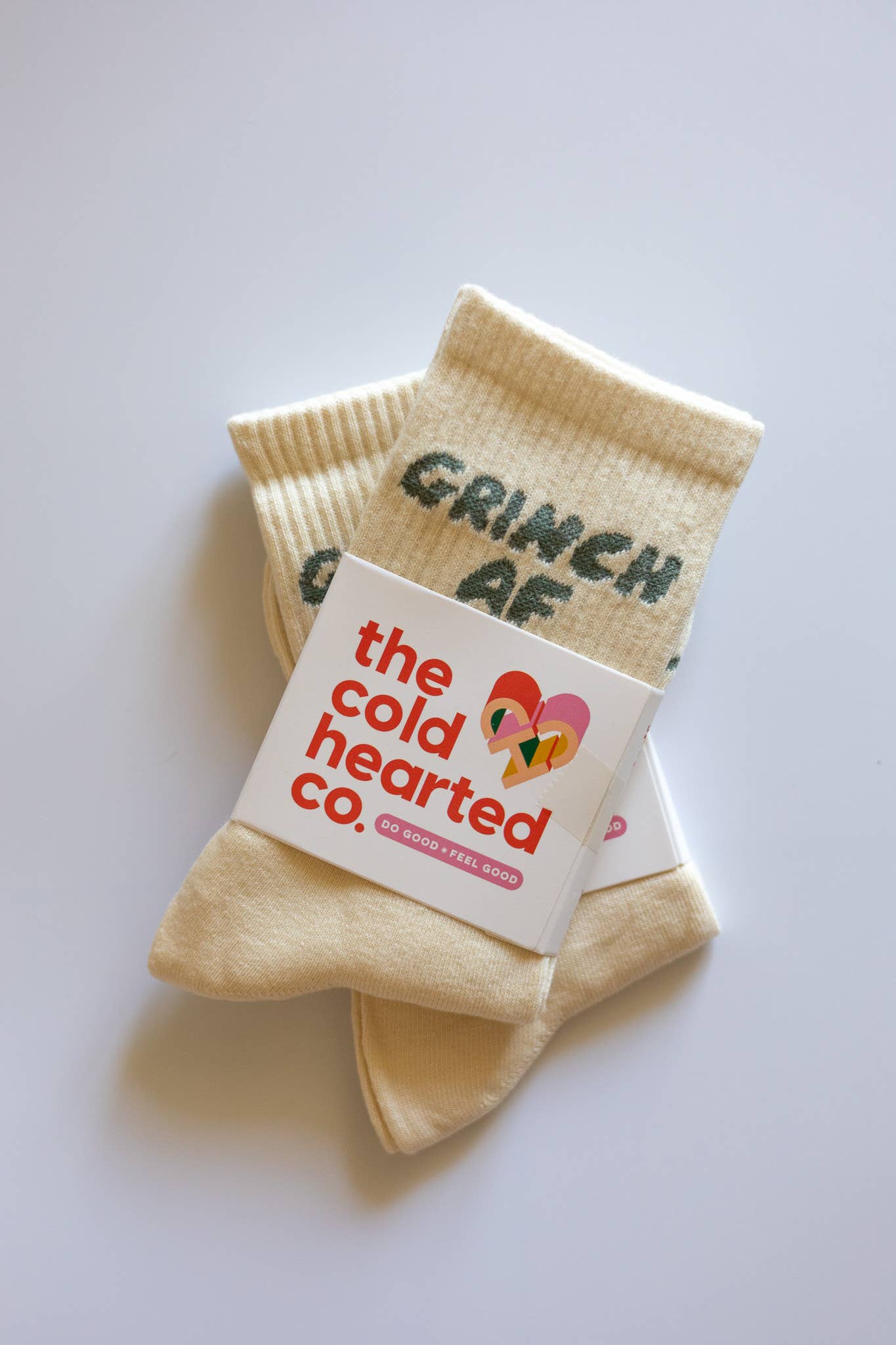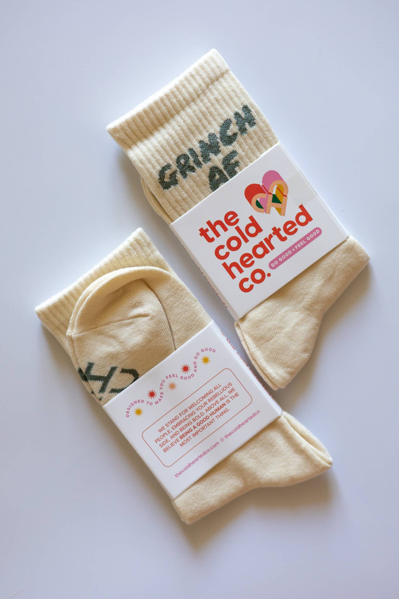 Stay cozy and sassy with our Grinch AF Crew Socks! These ultra-soft, cute socks feature bold lettering that shows off your festive, yet funny side. Perfect for adding some playful attitude to your winter wardrobe, they’ll keep your feet warm while letting everyone know you're embracing your inner Grinch in style!
