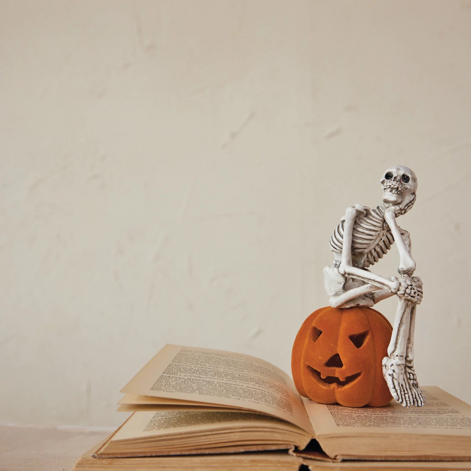 Add a spooky yet charming touch to your Halloween décor with The Sitting Skeleton. This playful resin skeleton comfortably sits atop a soft flocked jack-o'-lantern, blending eerie and cute in one delightful decoration. Perfect for tabletops or shelves, it brings a whimsical vibe to your festive celebrations.