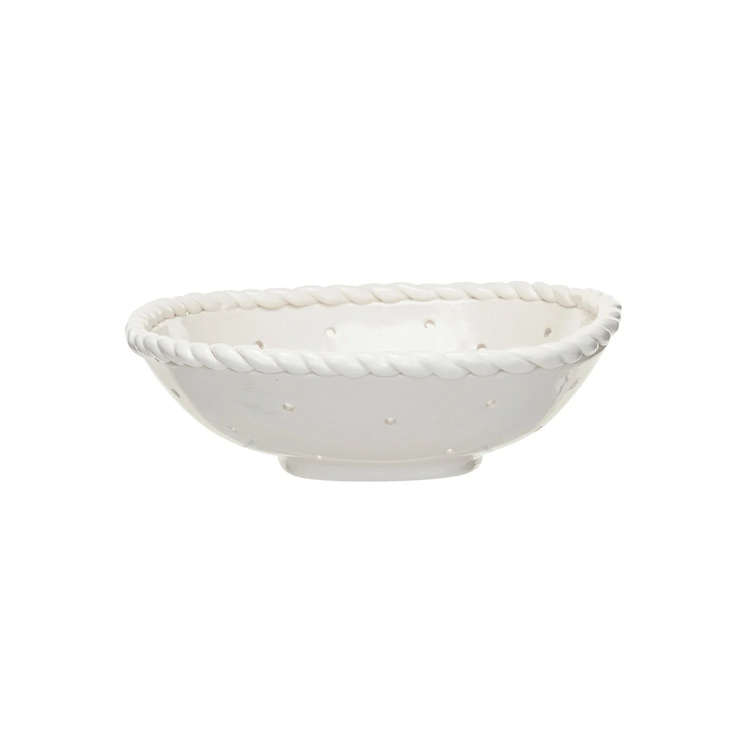 Strain pasta, vegetables, and grains with ease using this stoneware twisted edge colander. The distinctive twisted rim adds visual appeal while providing a secure grip for handling. Durable stoneware construction withstands daily use and resists chipping. The perforated design drains liquids efficiently, making it an essential kitchen tool for meal prep and cooking. Perfect for both functional kitchen work and serving presentations.