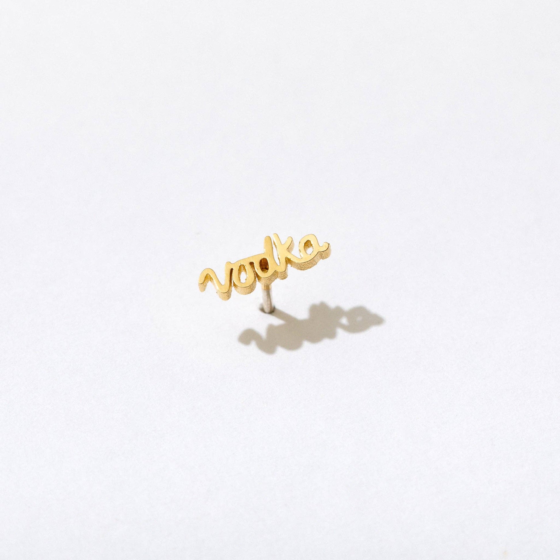 Just add lime and ginger beer, baby! This lil bud measures 3.4 x 10mm and is made with a brass base and plated with 14k gold. Custom cut in the handwritten cursive script of our own boss babe, Larissa, this is a 100% original design and 100% badass on a sterling silver friction push back post with sterling silver butterfly ear nut.